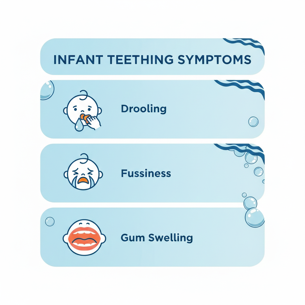 Teething symptoms in infants usually include drooling, gum swelling, irritability, chewing behavior, and mild sleep disruption. These symptoms often come and go as teeth move beneath the gums.