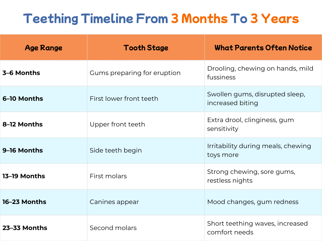 Teething comes in waves. A few uncomfortable days. A break. Then another wave as the next tooth moves closer. By age three, most children have a full set of baby teeth, but the early months often feel the most intense because everything is new.